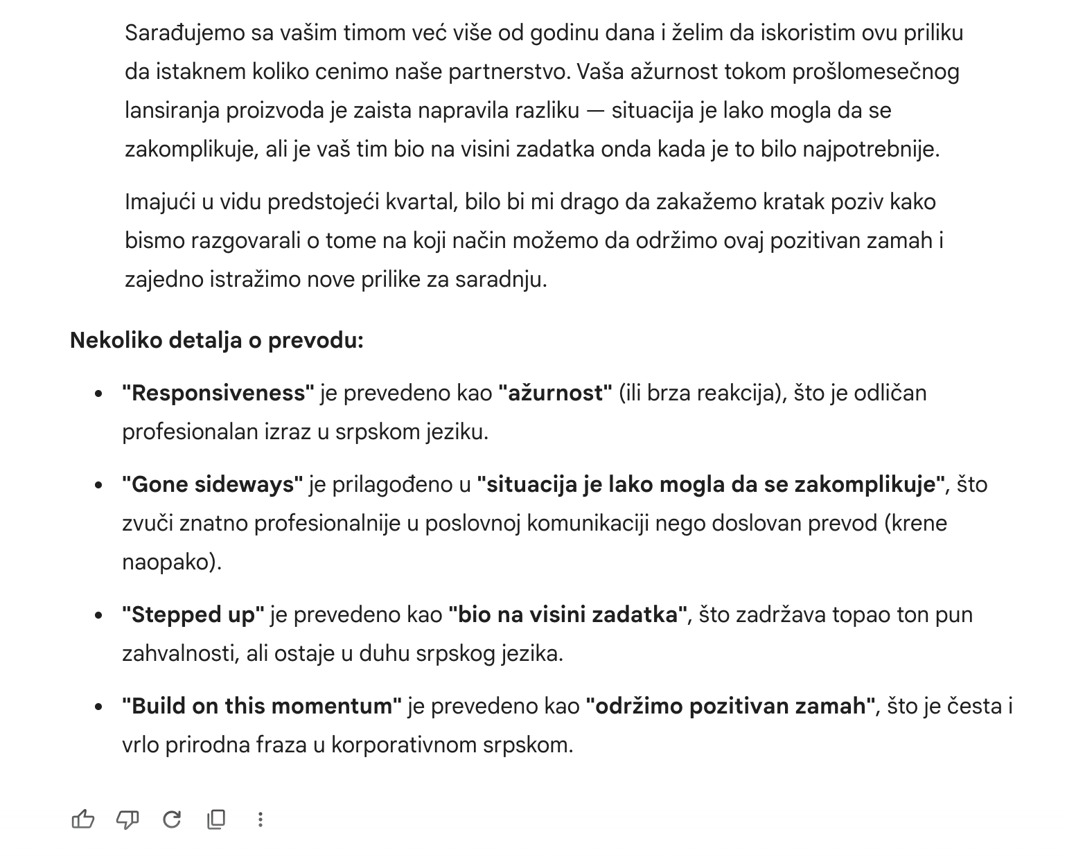 Copilot je razočarao. Njegov prevod "things could have gone sideways", "stvari su lako mogle krenuti u pogrešnom pravcu", gramatički je tačno, ali apsolutno niko to ne bi napisao u mejlu klijentu. Bukvalan, mehanički prevod. Ton je takođe promašen, previše formalno za situaciju u kojoj zahvaljuješ timu sa kojim radiš godinu dana.