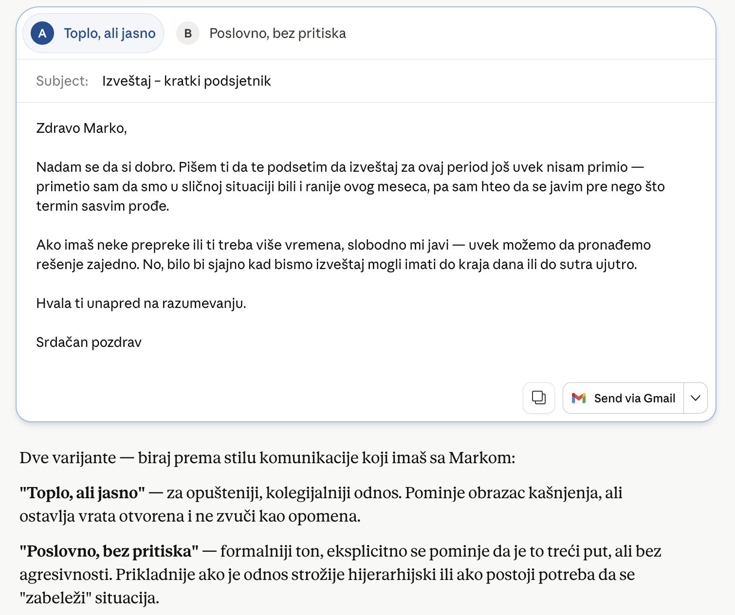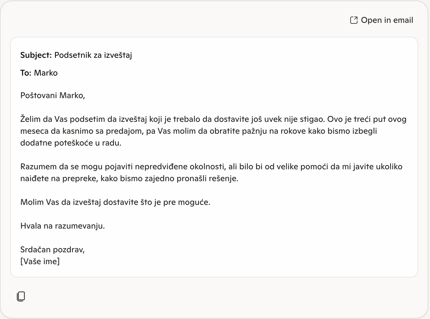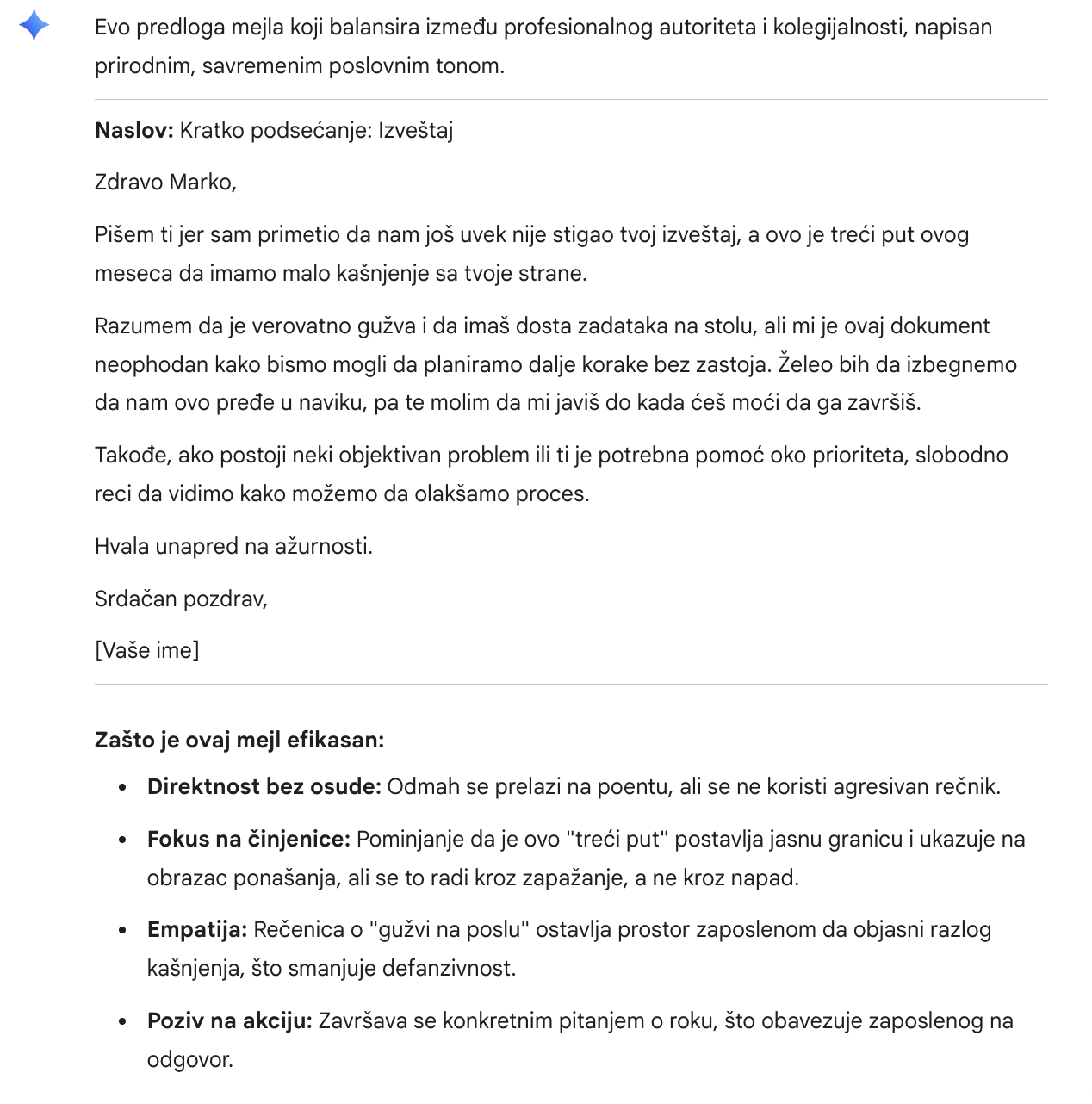 Prompt: "Napiši mi email na srpskom koji šalje šef zaposlenom. Treba ljubazno da ga podsetim da kasni sa izveštajem treći put ovog meseca, ali da ne zvučim agresivno. Ime zaposlenog je Marko."