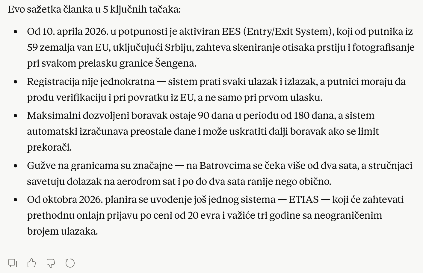 Copilot mi je odgovorio: "Nažalost, ne mogu da pročitam blokirani dokument koji si poslala. Ali mogu da ti pomognem tako što ću potražiti pouzdane informacije o novim pravilima za ulazak u EU i napraviti sažetak u 5 ključnih tačaka. Želiš li da to uradim?"