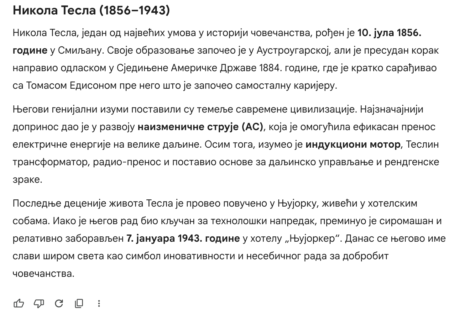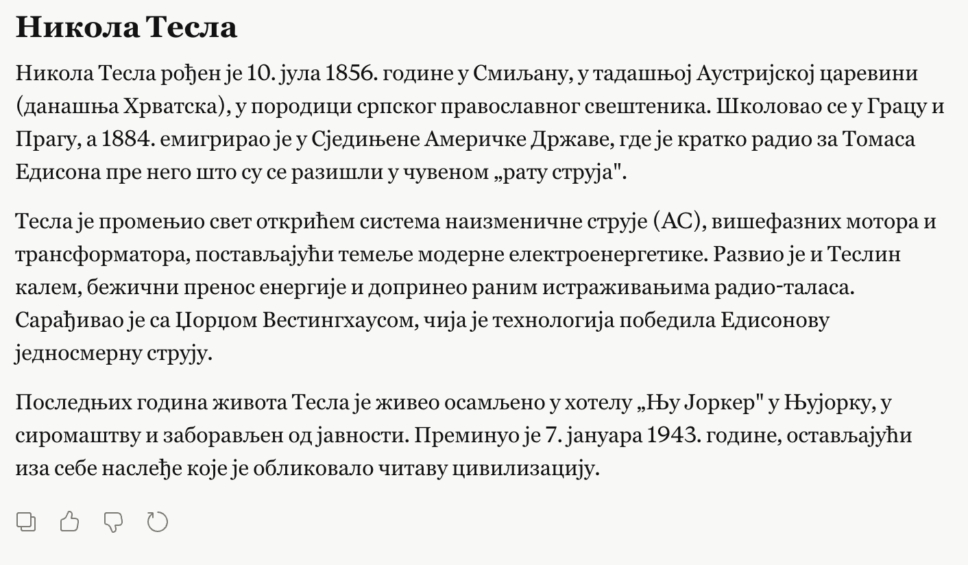 Prompt (na ćirilici): "Напиши ми кратку биографију Николе Тесле на ћирилици, 150 речи. Обухвати његово рођење, најважније проналаске и последње године живота."