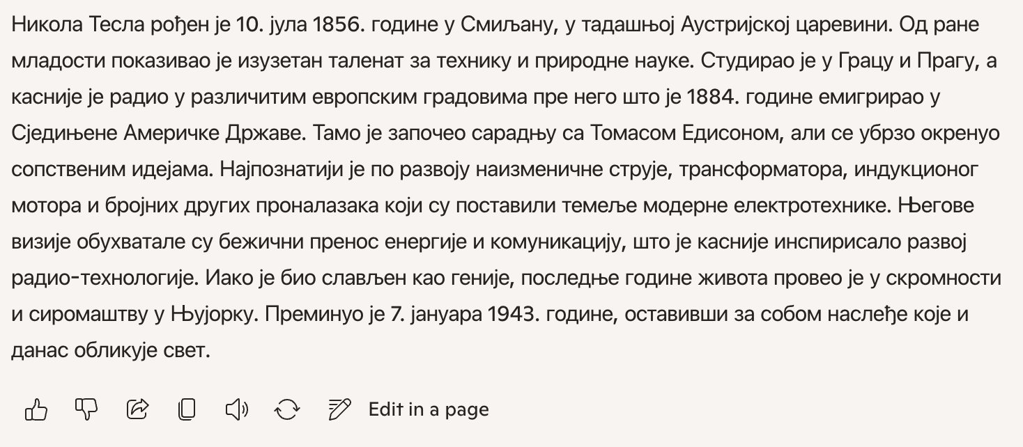 ChatGPT je napravio nešto drugačije, i zanimljivo. Telo teksta jeste ćirilicom, ali je imena Nikola Tesla i Thomas Edison ostavio na latinici jer ih je linkovao. Linkovi vode na englesku verziju koja se pojavila sa strane u chatu. Dalje, svi paragrafi su bili linkovani na relevantne internet resurse, i dodao je slike Tesle, njegove laboratorije, i istorijskih fotografija.