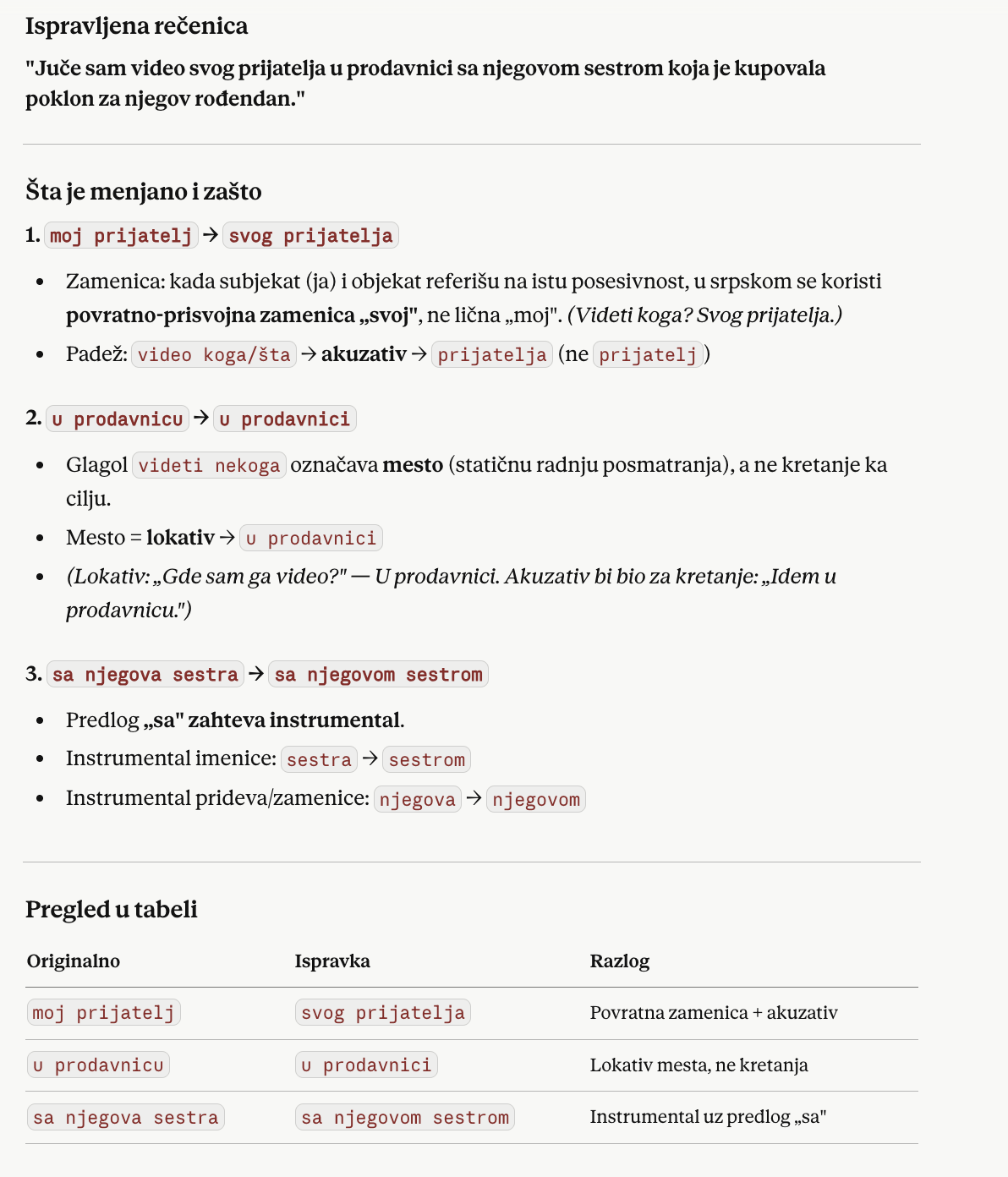 Rečenica ima tri greške: "video moj prijatelj" (treba akuzativ), "u prodavnicu" (treba lokativ), i "sa njegova sestra" (treba instrumental). Plus postoji i jedna suptilnija greška koja je pravi test za AI: "moj prijatelj" bi trebalo da bude "svog prijatelja" (povratna prisvojna zamenica kad se odnosi na subjekta rečenice).