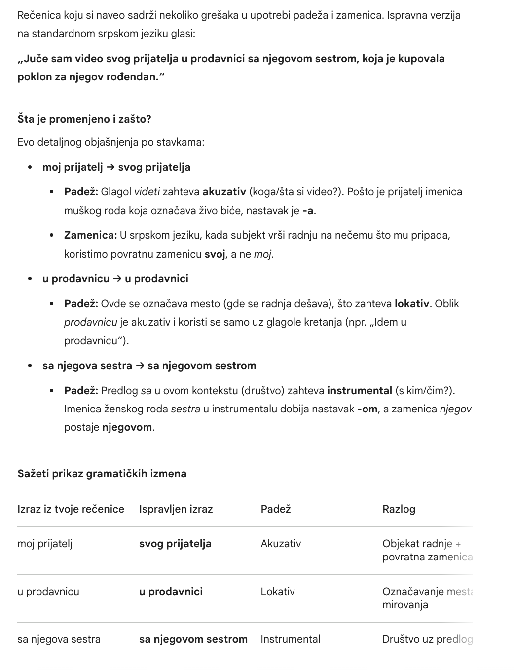 Prompt: "Ispravi gramatiku i padeže u ovoj rečenici, objasni šta si menjao: 'Juče sam video moj prijatelj u prodavnicu sa njegova sestra koja je kupovala poklon za njegov rođendan.'"